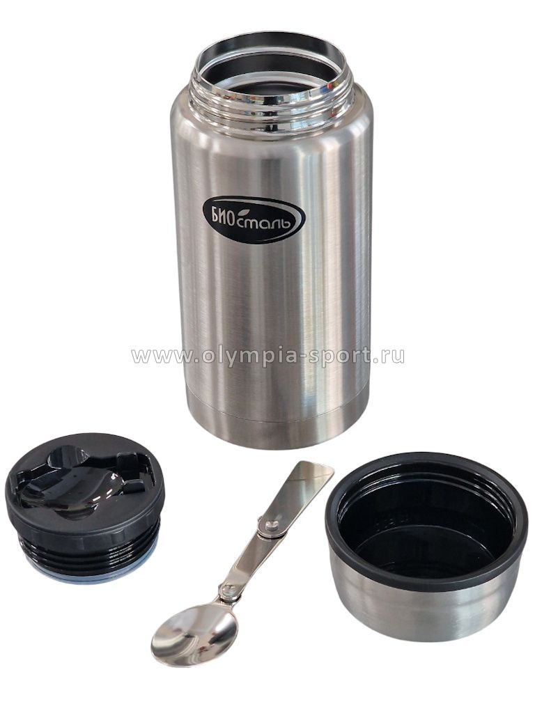 ермос для еды "Биосталь" с ложкой изготовлен из высококачественной нержавеющей стали. Термос с широкой горловиной и складной ложкой, которая удобно размещается в пробке. Пробка имеет специальный контейнер для хранения специй.